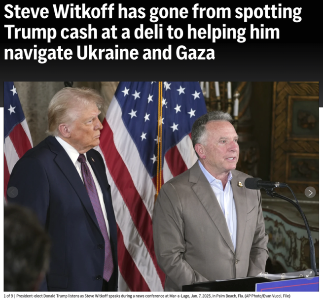 △美联社报道,威特科夫早年在熟食店帮特朗普付款三明治,如今帮他斡旋乌克兰问题和加沙问题。