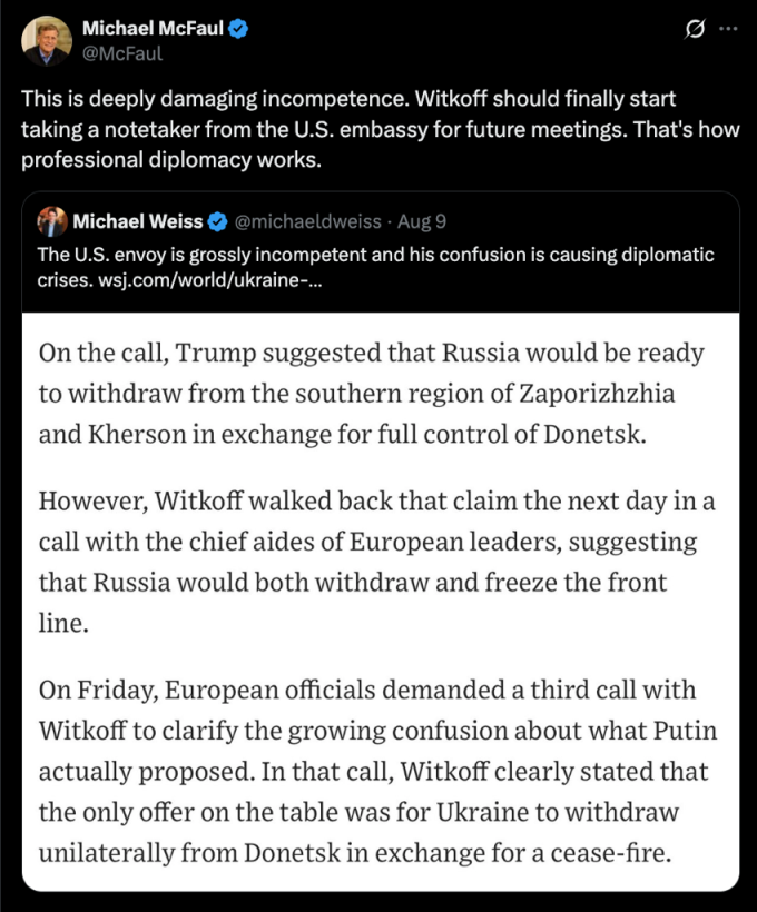 首先当然是来自政治外交圈的质疑。前美国驻俄大使迈克尔·麦克福尔(Michael McFaul)就在X平台上公开表示,“威特科夫以后应该带上美国大使馆的会议记录员,这才是专业外交应有的做法”,他讽刺威特科夫外交不专业又混乱,直言“这是严重损害性的无能行为” 。