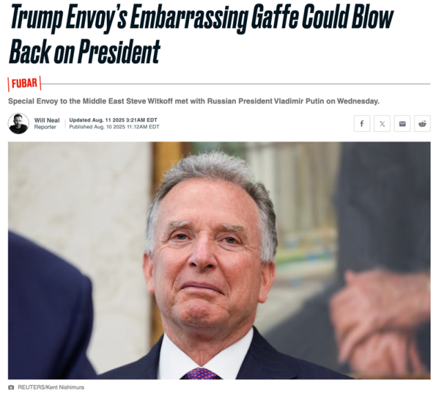△美国新闻网站《每日野兽》(The Daily Beast)报道,威特科夫误解了普京结束战争的具体条件,他的失言将对特朗普产生反作用。