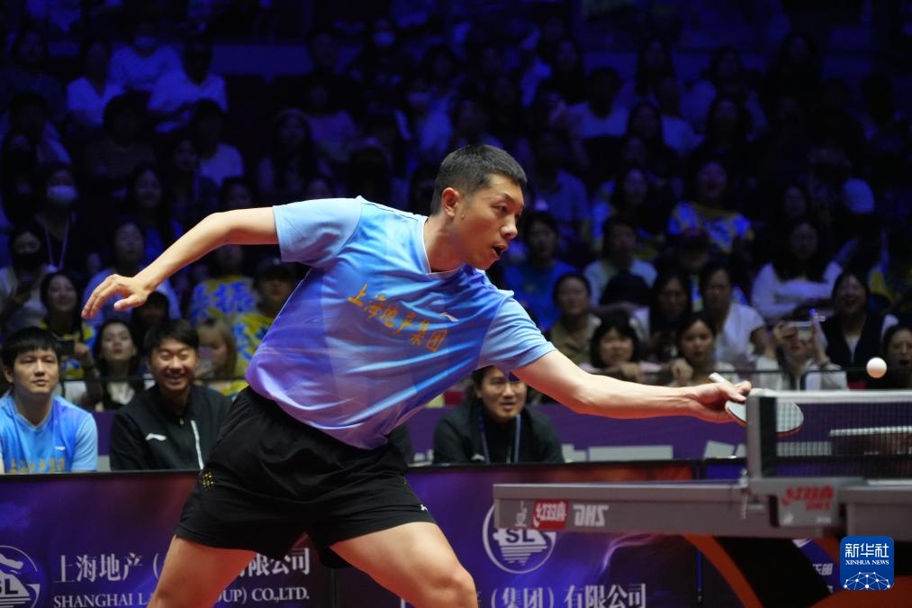 6月9日,上海地产集团队选手许昕在比赛中。他在单打比赛中3比1战胜山东鲁能队选手徐瑛彬。新华社记者 落飞麟 摄