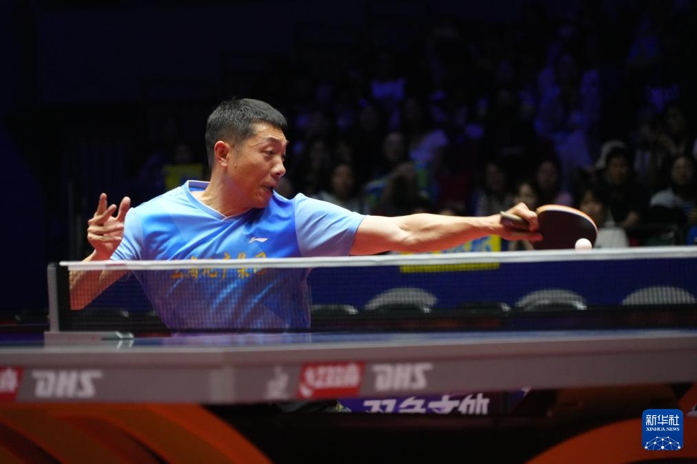 6月9日,上海地产集团队选手许昕在比赛中回球。他在单打比赛中3比1战胜山东鲁能队选手徐瑛彬。新华社记者 落飞麟 摄