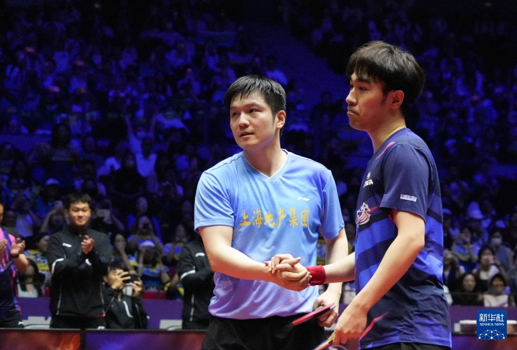 6月9日,上海地产集团队选手樊振东(上)在场边观战。新华社记者 杨世尧 摄
