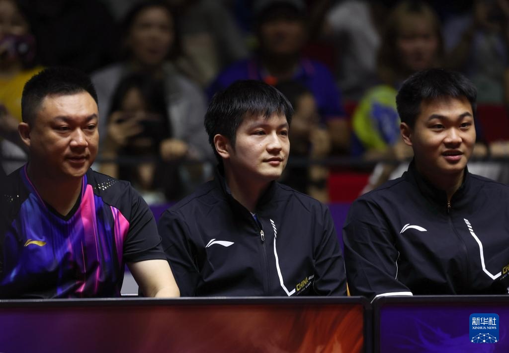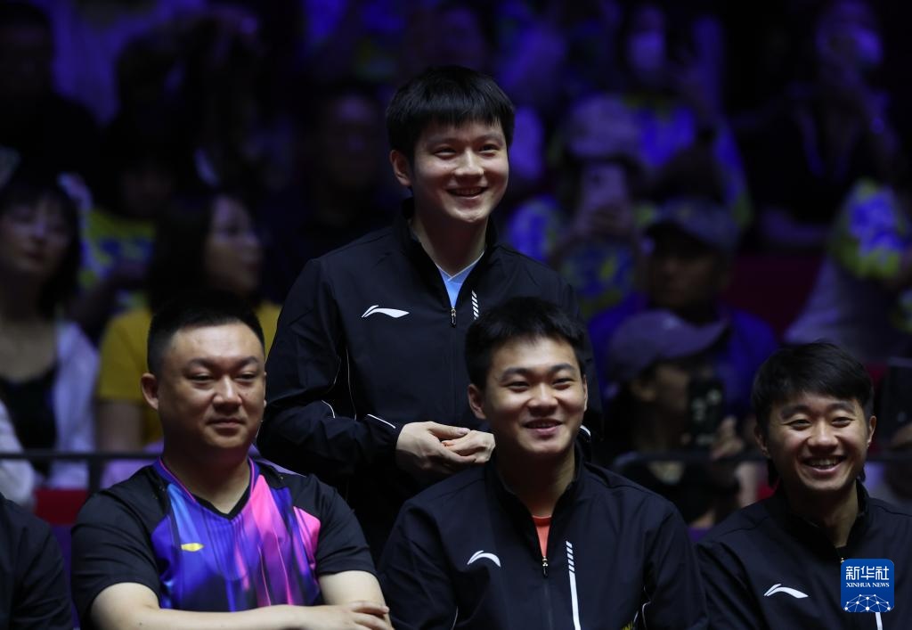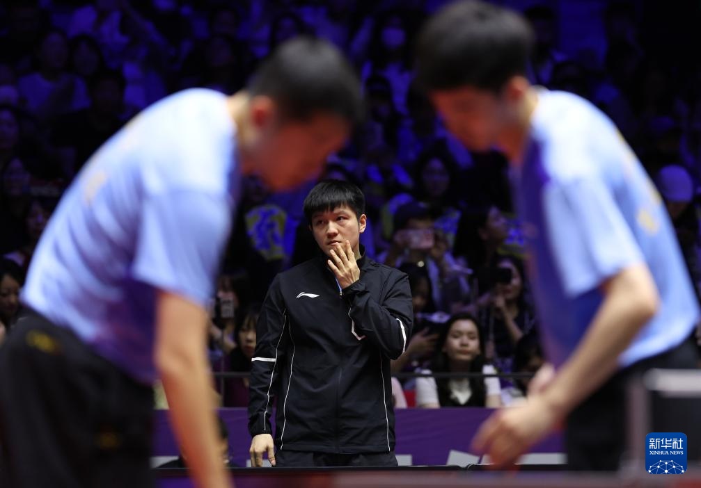 6月9日,上海地产集团队选手樊振东(中)在场边观战。新华社记者 杨世尧 摄