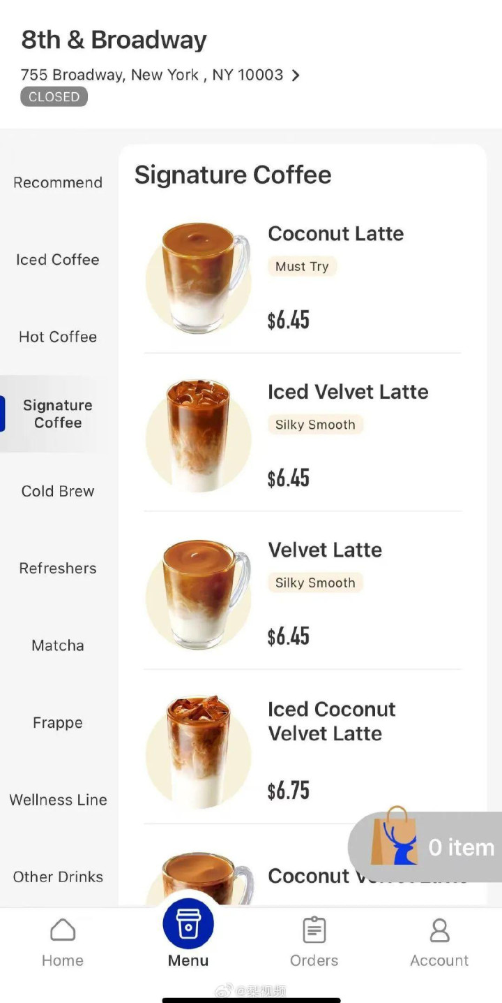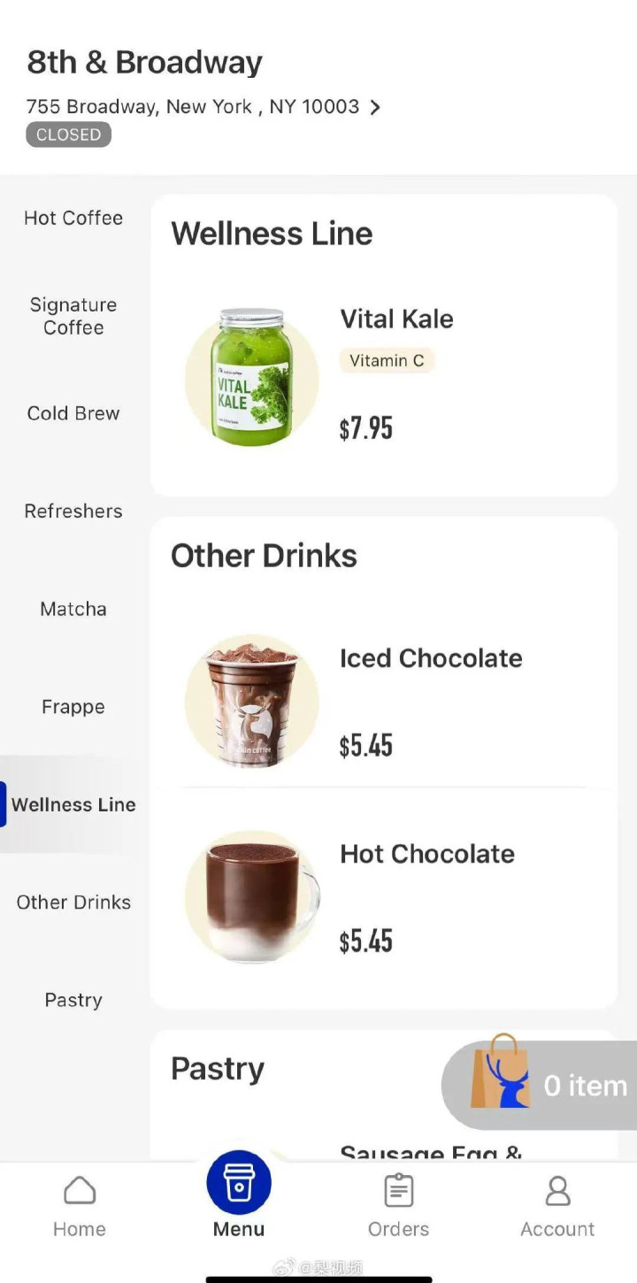 据瑞幸美国APP公布的菜单显示,其饮品价格在3.45美元(约合24.71元)至7.95美元(约合56.94元)之间。其中最便宜的滴滤咖啡3.45美元、美式咖啡4.45美元(约合31.87元)、拿铁5.75美元(约合41.19元);生椰拿铁、丝绒拿铁定价6.45美元(约合46.2元);瑞纳冰定价6.75美元(约合48.35元),其中最贵的羽衣果蔬饮品定价7.95美元。